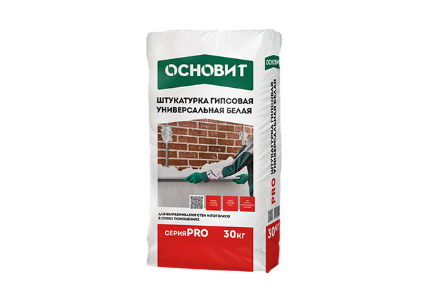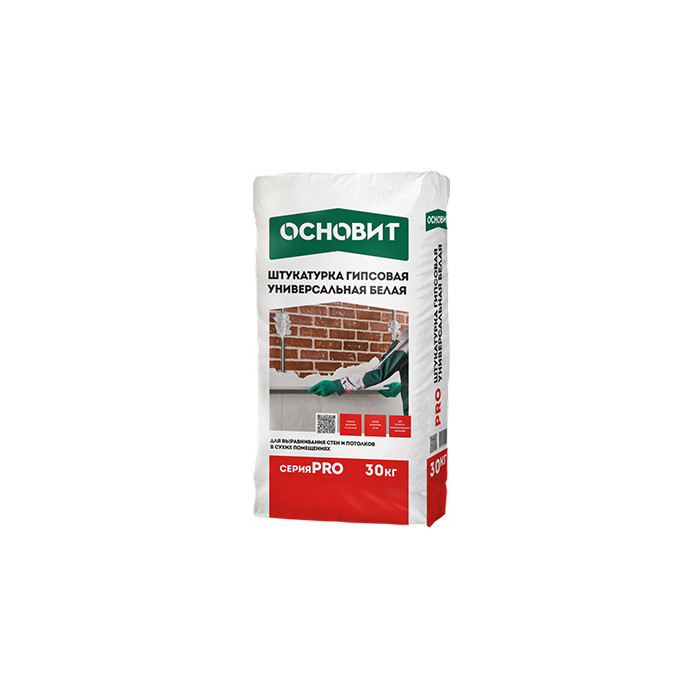 Гипсовая штукатурка универсальная Основит PRO белая 30 кг – это высококачественный строительный материал, который предназначен для выравнивания стен и потолков внутри помещений. Она изготовлена на основе гипса с добавлением специальных модификаторов, что обеспечивает отличные эксплуатационные характеристики. Эта штукатурка легко наносится, быстро сохнет и позволяет создать идеально ровную поверхность, готовую к дальнейшей отделке.