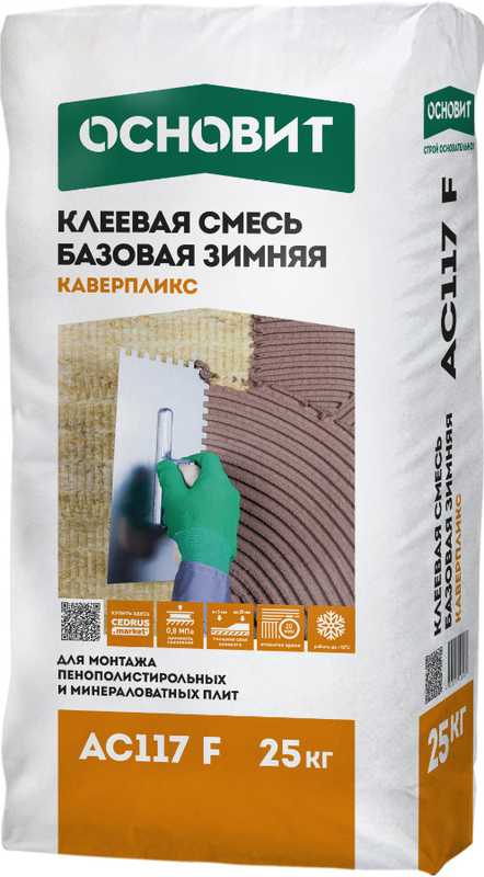 Клеевая смесь ОСНОВИТ КАВЕРПЛИКС AC117 F ЗИМНЯЯ представляет собой высококачественный продукт, разработанный специально для использования в холодное время года. Эта смесь обладает уникальными свойствами, которые позволяют ей сохранять свои рабочие характеристики даже при низких температурах. Основой смеси являются цемент и специальные добавки, которые обеспечивают надежное сцепление с различными поверхностями. Клеевая смесь легко наносится и быстро схватывается, что делает ее незаменимой для проведения ремонтных и строительных работ в зимний период.