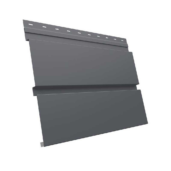 Металлический софит Квадро брус без перфорации представляет собой высококачественный отделочный материал, предназначенный для облицовки подшивки карнизных свесов и фронтонов зданий. Изготовленный из прочной стали с полимерным покрытием GreenCoat Pural BT, этот софит отличается долговечностью и устойчивостью к атмосферным воздействиям. Цветовая гамма, представленная в оттенке темно-серый (RAL7024 мокрый асфальт), придает фасаду элегантный и современный вид. Матовая текстура поверхности не только улучшает эстетические качества, но и скрывает мелкие загрязнения, что делает уход за софитом еще более простым.