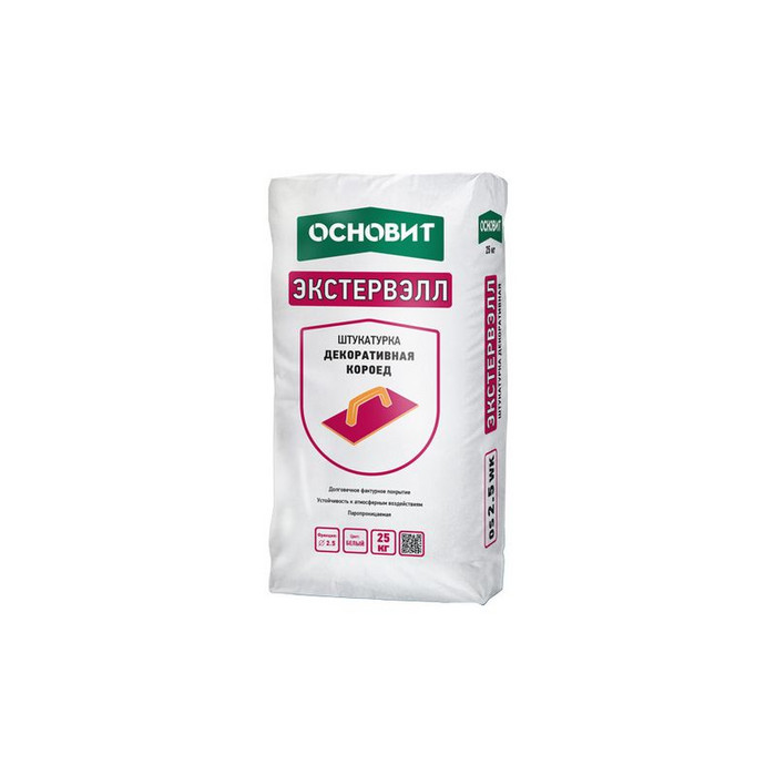 Штукатурка декоративная ОСНОВИТ ЭКСТЕРВЭЛЛ OM-1.5 WK короед, 25 кг – это высококачественный материал, предназначенный для создания уникальных и эстетически привлекательных фасадов и интерьеров. Она представляет собой готовую к применению смесь на основе цемента, которая после нанесения образует рельефную поверхность с характерным рисунком "короед". Этот рисунок напоминает следы, оставленные жуком-короедом на древесине, что придает поверхности особую фактуру и визуальную привлекательность.
