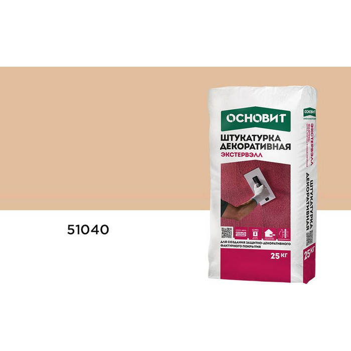 Штукатурка декоративная ОСНОВИТ КОРОЕД ЭКСТЕРВЭЛЛ OM-2.5 WK, 51040, 2,5 мм, 25 кг представляет собой высококачественный материал для отделки фасадов и внутренних стен. Она изготовлена на основе цемента и минеральных наполнителей, что обеспечивает долговечность и устойчивость к атмосферным воздействиям. Эта штукатурка имеет зернистую структуру, которая создает эффект "короеда" – характерный рисунок с бороздками, придающий поверхности уникальный и эстетичный вид.