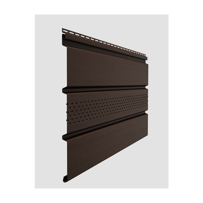 Софит Docke STANDARD T4 с центральной перфорацией в цвете шоколад – это современный и функциональный материал для обустройства вентилируемых фасадов и подшивки карнизов. Изготовленный из высококачественного ПВХ, этот софит отличается долговечностью и устойчивостью к атмосферным воздействиям. Центральная перфорация обеспечивает эффективную вентиляцию подкровельного пространства, что способствует продлению срока службы кровельной системы и предотвращению образования конденсата.