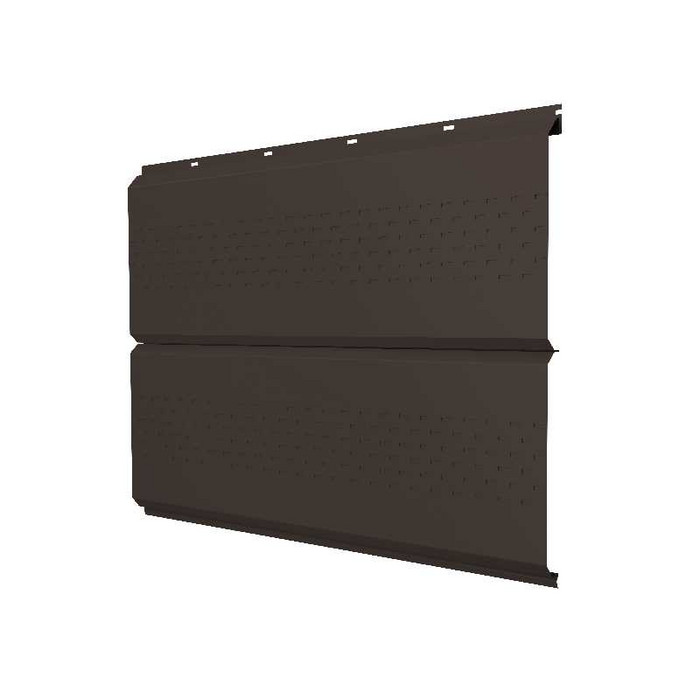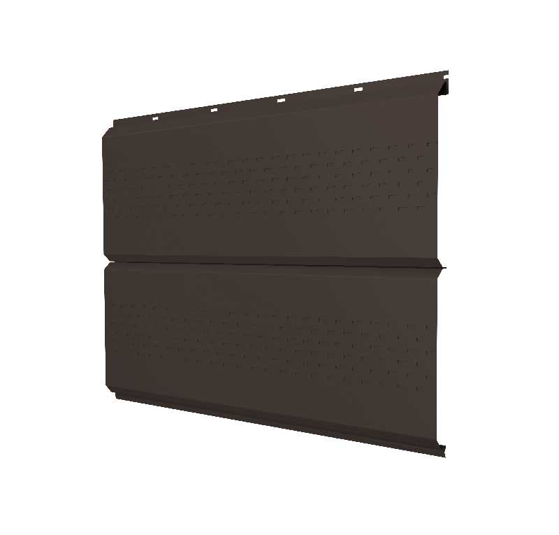 Софит ЭкоБрус new c перфорацией 0,45 PE RR 32 темно-коричневый – это современный и функциональный материал, предназначенный для облицовки подшивки карнизных свесов и фронтонов зданий. Изготовленный из высококачественной стали с полимерным покрытием, этот софит отличается долговечностью и устойчивостью к атмосферным воздействиям. Перфорация в виде отверстий диаметром 0,45 мм обеспечивает эффективную вентиляцию подкровельного пространства, что способствует продлению срока службы кровельной системы.