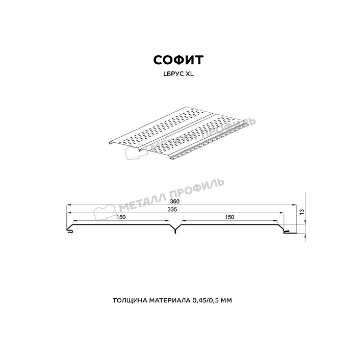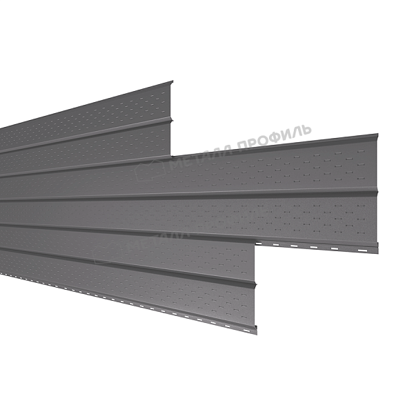 Софит перфорированный Lбрус-XL-14х335 (VALORI-20-Grey-0.5) – это современный строительный материал, который используется для обустройства подшивки карнизных свесов и вентилируемых фасадов. Изготовленный из высококачественной стали с полимерным покрытием, этот софит отличается долговечностью и устойчивостью к атмосферным воздействиям. Перфорированная поверхность обеспечивает необходимую вентиляцию подкровельного пространства, что способствует продлению срока службы кровельной системы.